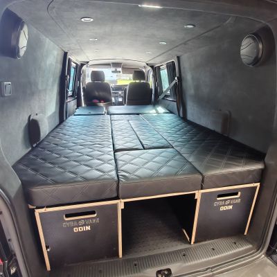 The ODIN system transforms your van into a U-shape lounge, a full-size bed measuring 1800mm x 1650mm, or a work-ready storage solution in minutes. Ideal for couples, families, and mixed-use vans, it offers massive internal storage with top access, perfect for long trips or heavy gear.