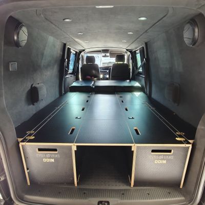 Elevate your VW T6 LWB with our premium ODIN modular furniture system, featuring two robust 1800mm cabinets precision-engineered for a perfect fit and unparalleled adaptability.